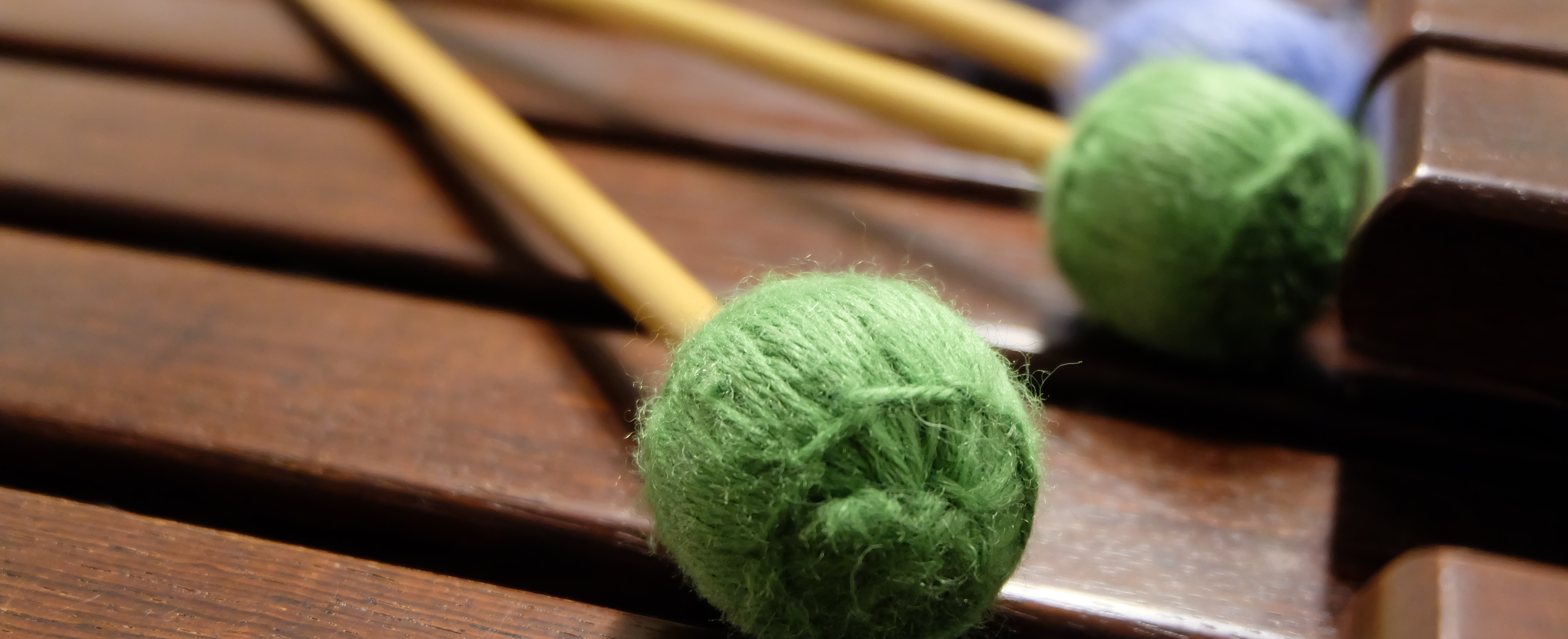 マレット…マリンバを叩く時に使う2本1組の棒のようなもの。上のマリンバの鍵盤に乗っている緑の丸がついたものがマレットです。